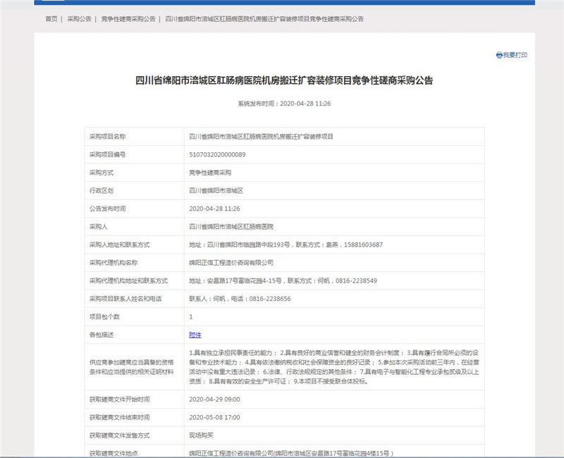 【綿陽正信·招標(biāo)部消息】我公司受綿陽市肛腸病醫(yī)院委托,經(jīng)綿陽市涪城區(qū)財(cái)政局審批,對綿陽市肛腸病醫(yī)院機(jī)房搬遷擴(kuò)容裝修項(xiàng)目擬采用競爭性磋商方式進(jìn)行采購,2020年04月28日已在四川省政府采購網(wǎng)及綿陽政府采購網(wǎng)將綿陽市肛腸病醫(yī)院機(jī)房搬遷擴(kuò)容裝修項(xiàng)目競爭性磋商采購公告掛網(wǎng)公示。