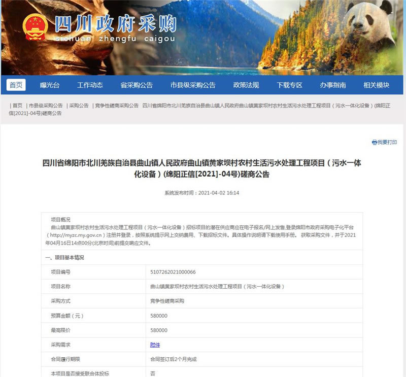 【綿陽(yáng)正信·招標(biāo)部消息】我公司受北川羌族自治縣曲山鎮(zhèn)人民政府委托,對(duì)曲山鎮(zhèn)黃家壩村農(nóng)村生活污水處理工程項(xiàng)目(污水一體化設(shè)備)(第二次)擬采用競(jìng)爭(zhēng)性磋商方式進(jìn)行采購(gòu),本項(xiàng)目于2021年06月09日在四川省政府采購(gòu)網(wǎng)及綿陽(yáng)市政府采購(gòu)網(wǎng)公示,預(yù)計(jì)于2021年06月21日14:00在綿陽(yáng)市安昌路17號(hào)富臨花園四樓15號(hào)開標(biāo)。