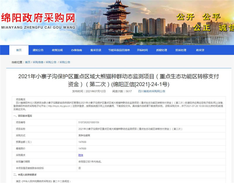 【綿陽正信·招標(biāo)部消息】我公司受四川省綿陽市北川羌族自治縣小寨子溝國家級自然保護(hù)區(qū)管理處委托,對2021年小寨子溝保護(hù)區(qū)重點(diǎn)區(qū)域大熊貓種群動(dòng)態(tài)監(jiān)測項(xiàng)目(重點(diǎn)生態(tài)功能區(qū)轉(zhuǎn)移支付資金)(第二次)擬采用競爭性磋商方式進(jìn)行采購,本項(xiàng)目于2021年07月12日在四川省政府采購網(wǎng)和綿陽市政府采購網(wǎng)掛網(wǎng)公示,預(yù)計(jì)于2021年07月26日10:00在綿陽市安昌路17號富臨花園四樓15號開標(biāo)。
